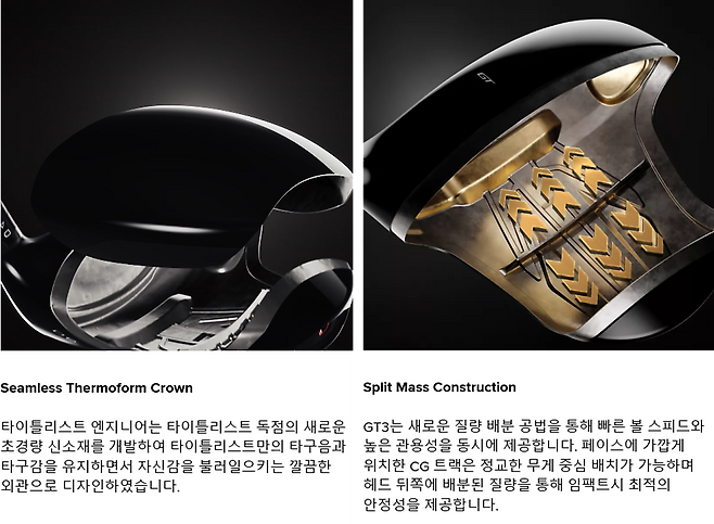 이번 디자인 이야기는 타이틀리스트로서 상당히 새로운 부분입니다. 지난 10년간 대부분 드라이버 회사들은 카본 크라운으로 옮겨갔음에도 타이틀은 꿋꿋이 티타늄 크라운을 고집해왔습니다. 그러나 이번 GT 모델은 완전 새로운 초경량 신소재를 개발했다는 게 회사의 설명입니다. 또한, 수많은 투어 프로와 엘리트 선수들이 선호하는 타이틀 만의 타감과 소리, 느낌을 유지했다고 자부하네요.