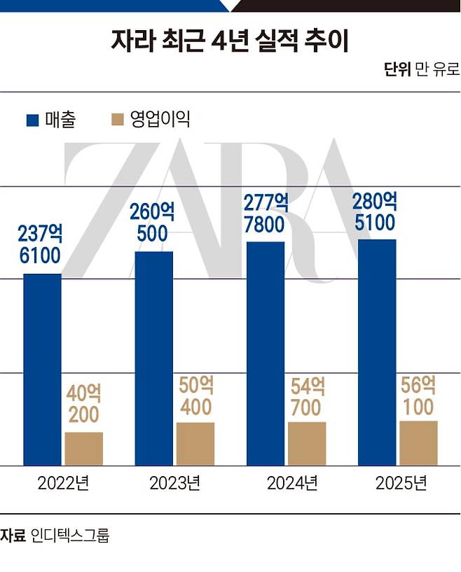 자라의 핵심 과제는 외형 확장과 수익성 개선이다. 그룹 전체에서 차지하는 비중은 70%에 달하지만 성장세는 둔화하고 있어서다. 인디텍스그룹에 따르면 자라는 지난해 280억5100만 유로(약 49조원)의 매출을 기록했다. 전년(277억7800만 유로) 대비 1% 증가했다. 세전이익(PBT)은 같은 기간 3.6% 늘어난 56억100만 유로다. 세전이익률은 20.0%에 달한다. 같은 기간 이탈리아 명품 브랜드 구찌의 영업이익률이 16.0%를 기록한 것을 고려하면 명품보다 높은 수익성을 기록한 셈이다.