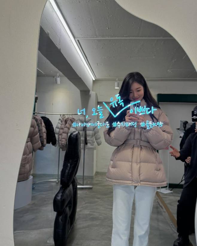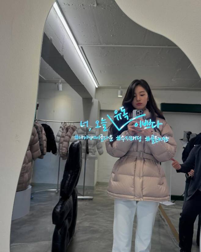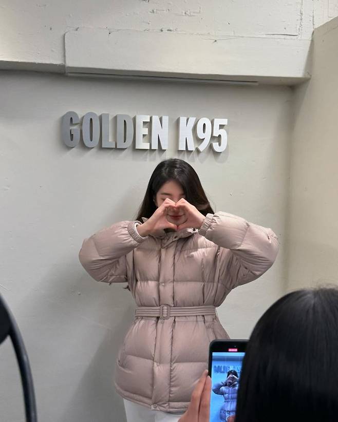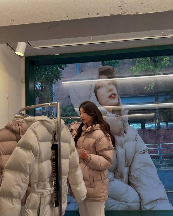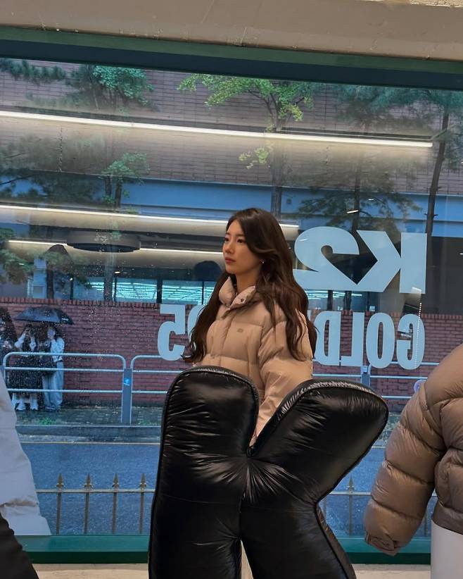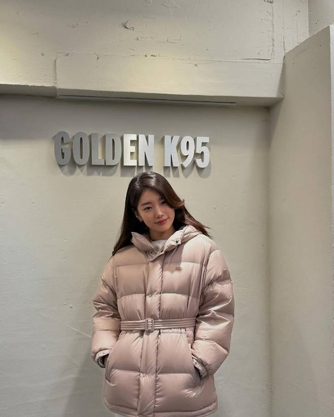 수지가 착용한 K2 골든 K95 베이글 다운은 솜털 함량 95%의 최고급 구스 충전재를 사용해 가볍고도 따뜻한 착용감을 제공합니다.
