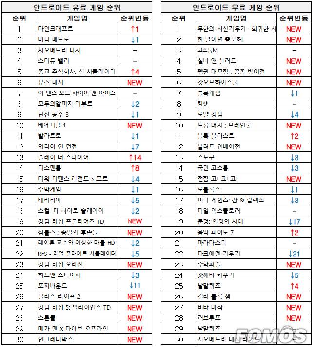 안드로이드 무료 게임 순위에서도 아이폰 무료 게임 순위와 마찬가지로 방치형 장르와 캐주얼 게임이 인기를 얻었다.