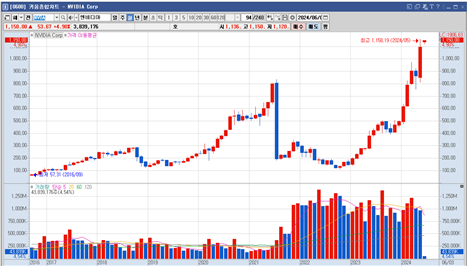 특히 2020년대 이후로 AI 광풍이 불었고 엔비디아는 GPU를 만들던 기술력으로 AI 칩을 생산하면서 전 세계에서 가장 주목받는 AI 수혜주로 등극했습니다. 이로 인해 2023년, 사상 처음으로 세계 반도체 기업 매출 1위에 등극했습니다. 최근 미국 주식 시장에서 다음 차트에서 보는 바와 같이 독보적인 주가 움직임을 기록하고 있습니다.