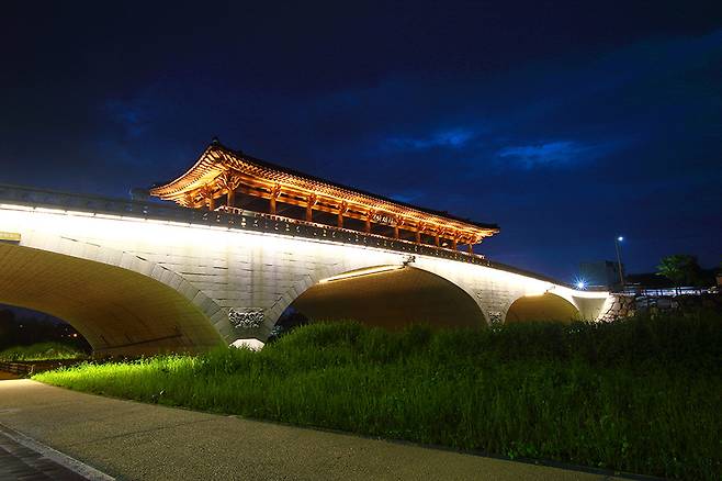 남천교는 길이 82.5m, 너비 25m로, 조선시대 홍예교를 떠올리게 하는 전통적 곡선을 살린 구조물입니다. 다리 양 끝과 기둥은 한옥 스타일로 조성돼, 주변 경관과 조화를 이루고 있습니다.