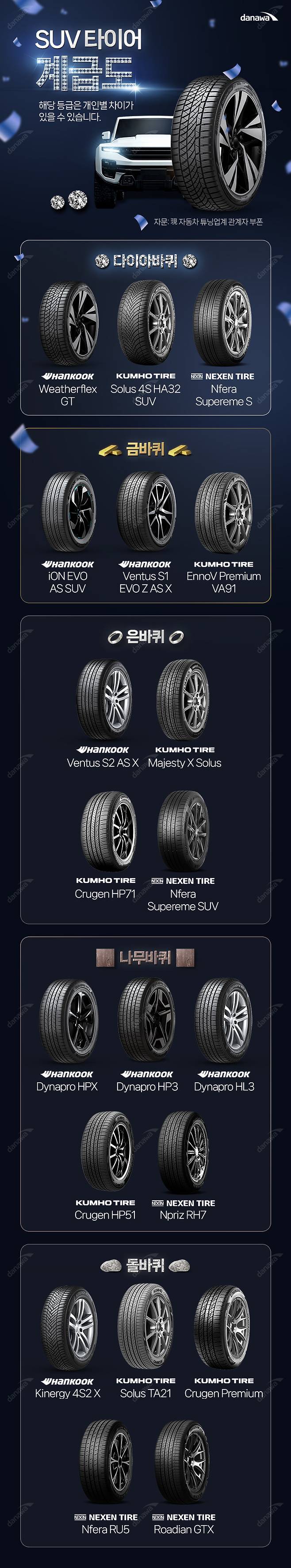 그래서 다나와가 준비했다. SUV 국산 올시즌, 올웨더 타이어를 기준으로 주행 성능, 내구성, 정숙성, 가격을 종합적으로 고려해 계급도를 나눴다. 타이어 교체를 앞두고 있다면 이번 계급도가 현명한 선택에 도움이 되길 바란다.