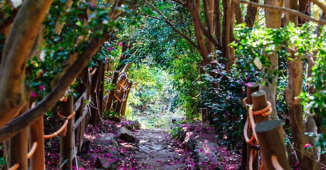 폭 1m 남짓한 동백나무 터널이 조성되어 있어 동화 속으로 들어서는 기분을 느낄 수 있으며, 머리 위로 동백나무 그늘이 드리워져 아늑한 분위기를 연출해요.