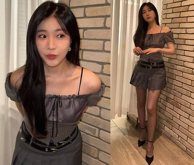 평소 활기차고 러블리한 이미지로 알려진 이해리는 이번엔 오프숄더 탑과 초미니 플리츠 스커트로 '시크한 언니룩'에 도전했습니다.