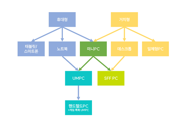 먼저, 미니PC는 노트북 같은 모바일 PC에서 파생된 후손이다. 일반적으로 내부 용량이 2L 이하로, 어른 손바닥 크기의 초소형 케이스를 사용하며, 노트북에 쓰이는 모바일 PC용 저전력 플랫폼을 탑재한다. 또한 별도의 파워서플라이 대신 시스템과 통합된 일체형 전원부를 사용하는 것이 특징이다. 저전력과 초소형 설계에 초점을 맞춘 것이 바로 미니PC다.