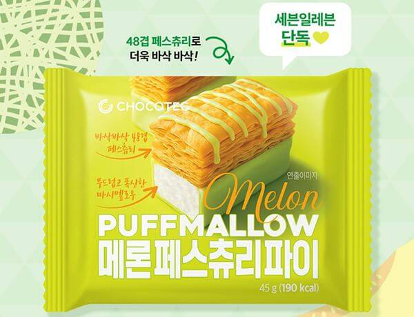편의점 세븐일레븐은 멜론맛을 향기롭게 즐길 수 있는 ‘메론 페스츄리파이’를 출시했다. 바삭바삭한 식감이 매력적인 48겹의 페스츄리를 활용한 제품이다. 페스츄리 밑에는 부드럽고 폭신하며 달콤하게 즐길 수 있는 마시멜로우가 있으며, 페스츄리 상단에는 멜론맛 초콜릿을 가득 얹어서 한층 강한 풍미를 느낄 수 있도록 만들어졌다. 편의점 세븐일레븐에서 만날 수 있는 제품으로, 가격은 2,900원이다.