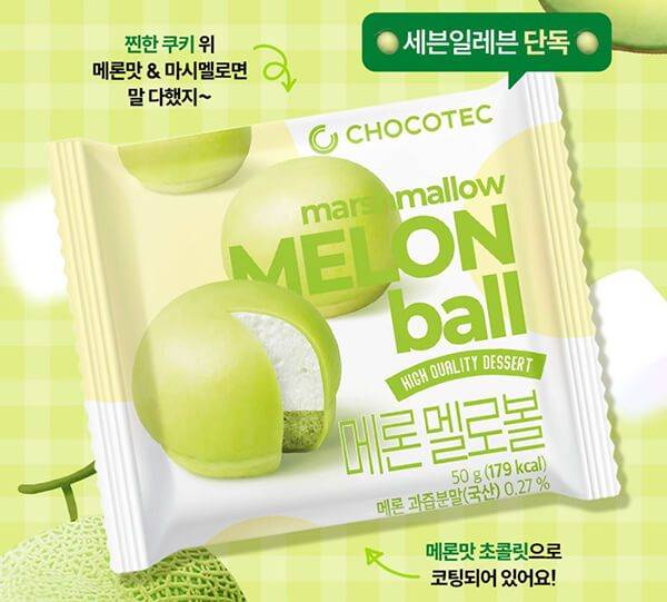 편의점 세븐일레븐은 멜론맛을 활용한 신제품 ‘메론멜로볼’을 출시했다. 멜론맛 쿠키를 활용해서 향긋한 풍미를 한층 강하게 느낄 수 있도록 만들어진 제품이다. 쿠키 위에는 마시멜로를 얹었으며, 멜론맛 초콜릿으로 코팅을 했다. 식후에 가벼운 디저트로 즐기기에 좋은 제품으로, 이색적인 분위기의 소용량 케이크로도 활용할 수 있다. 세븐일레븐에서만 만날 수 있는 제품으로, 가격은 3,000원이다.