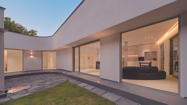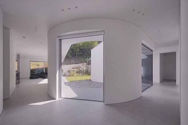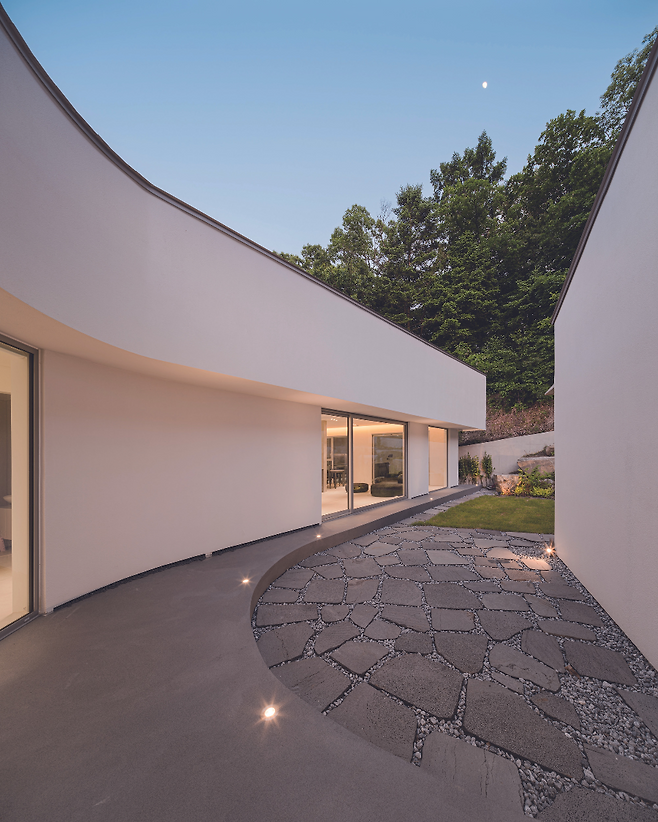 곡선형 중정과 복도, 사다리꼴 형태의 거실 및 주방, 처마가 돌출된 볼륨감이 주택에 다양한 깊이감을 더해주고 풍성한 장면들을 만들어낸다.
