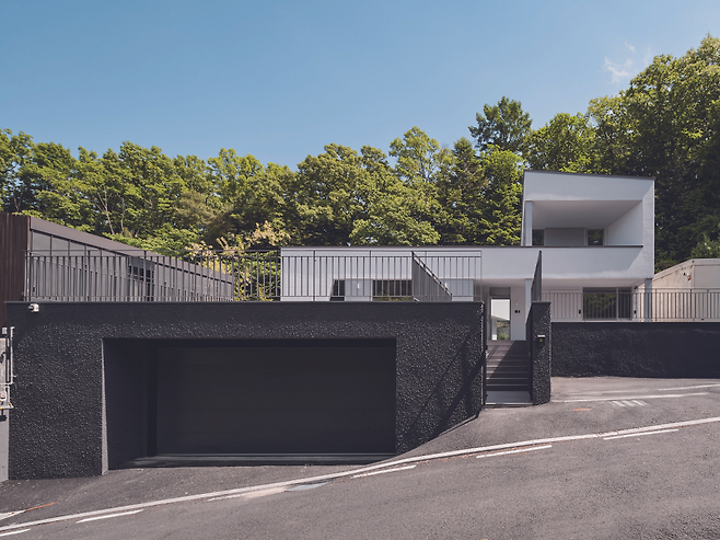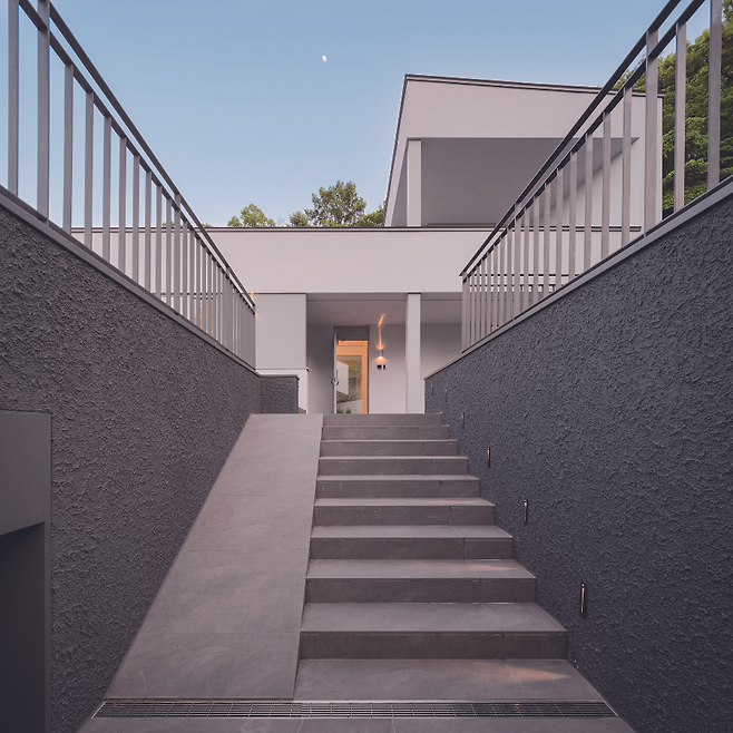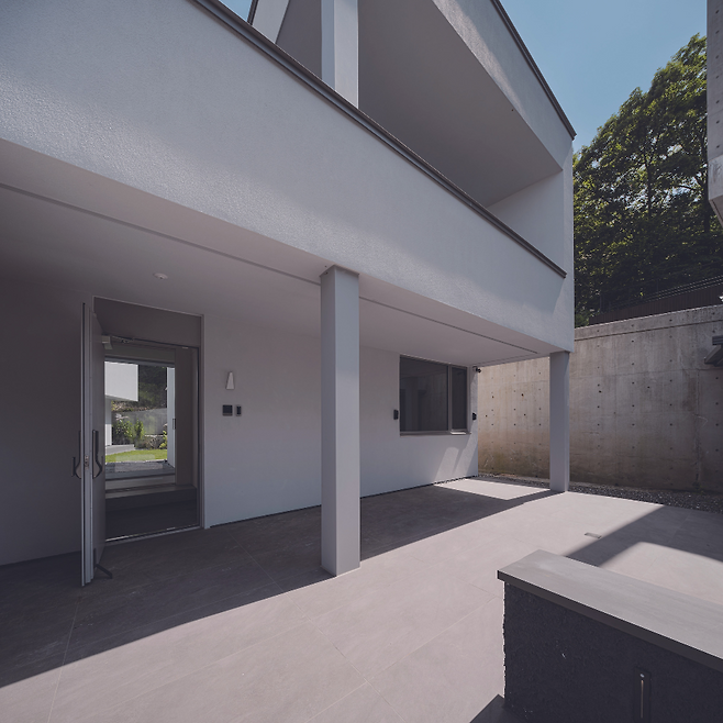 경사가 심한 대지 위로 평지를 만들기 위해 옹벽을 세워야 했다. 이 과정에서 자연스럽게 지하 공간이 생기게 됐으나, 숲이 가까워 습기가 많이 발생하고 유지관리가 어려워질 수 있다고 분석했다. 이에 공사 기간과 비용을 고려해 최소한의 지하 공간을 계획하고, 성토와 절토를 최소화하는 방향으로 외부 주차장과 대문 위치를 계획했다.