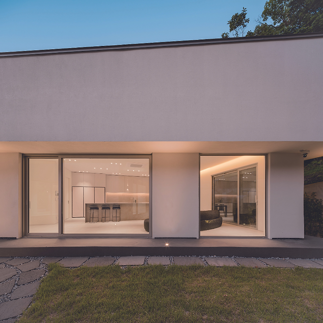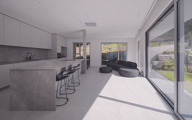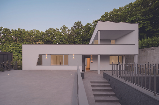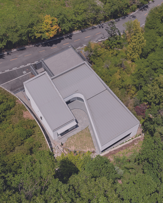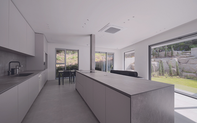 ‘ㄷ’자 형태로 낮고 넓게 펼쳐진 주택의 중심에는 중정을 배치해 집안 깊숙이 자연 풍경과 채광이 들어오도록 계획했다. 현관문을 열고 들어서면 중정, 거실과 주방 그리고 울창한 숲의 모습이 한눈에 펼쳐진다.