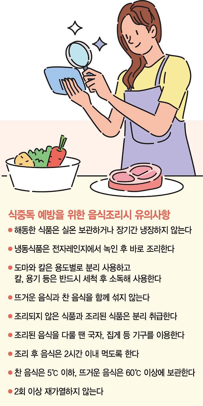 식중독을 예방하려면 식재료는 신선한 것으로 필요한 만큼만 구입하고, 식기세척기 등 열이 많이 발생하는 기구 주위를 피해서 보관해야 한다. 음식물을 조리·섭취할 때는 세균이 번식하기 쉬운 손을 신경 써서 세척하며, 익힌 음식은 익히지 않은 음식과 분리해 안전한 온도에서 보관해야 한다. 조리된 음식은 가능한 상온에 두면 안되고 2시간 이내 섭취할 수 있도록 해야 한다.