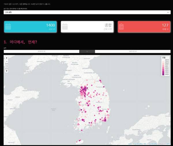 과학 전문매체 기자 출신 윤신영씨는 지난달 28일 자신이 수집한 싱크홀 발생 이력을 바탕으로 ‘시민용 싱크홀 지도’를 SNS에 공유했다. 윤씨는 국토안전관리원, 지하안전정보시스템 등에서 싱크홀 발생 위치와 원인을 포함한 데이터를 수집해 시각화했다. 그가 조사한 바에 따르면, 2018년 1월부터 2024년 8월까지 전국에서 벌어진 싱크홀 등 지반침하 사고 등 총 1400건으로 집계됐다. 서울·부산·대전 등 대도시에서 집중적으로 발생하는 것을 확인할 수 있다.