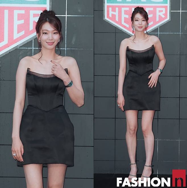 이날 이호정은 구조적인 라인이 돋보이는 코르셋 디테일의 블랙 튜브톱 미니 드레스룩으로 도회적인 시크미를 발산했다.