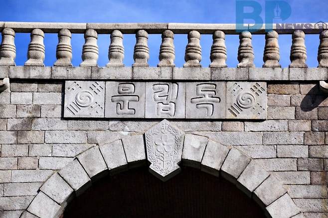 화강석을 쌓아 만든 독립문의 중앙에는 홍예문이 있다. 홍예문의 이맛돌에는 대한제국의 상징이던 ‘오얏꽃’ 문양이 새겨져 있다.