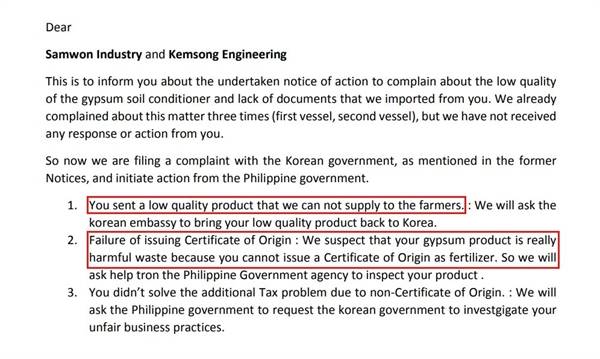 | ▲ 부영주택의 폐기물을 수입한 필리핀의 'BTBD 벤처스'가 지난 2018년 12월 금송이엔지와 삼원환경에 보낸 'Notice of Complaint'. 이 업체는 "우리는 당신의 석고 제품이 아주 유해한 폐기물이라고 의심한다”라고 썼다. |