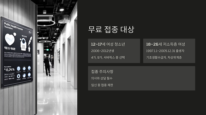 만 18세 ~ 26세 저소득층 여성 (1997년 1월 1일 ~ 2005년 12월 31일 출생자): 기초생활보장 수급자 및 차상위 계층 여성이 대상이며, 무료 접종 백신 종류는 확인이 필요합니다. (2006년생 여성은 2025년부터 무료 접종 대상에서 제외될 수 있으므로 확인이 필요합니다.)