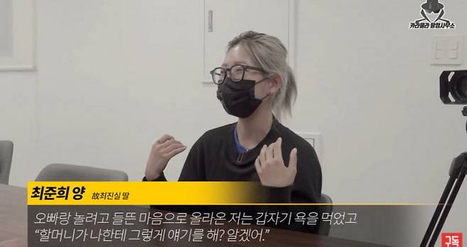 또 최준희는 지난 2023년 7월 14일 유튜브 채널 '카라큘라 탐정사무소'에는 최준희의 주거침입 논란과 학폭 관련 인터뷰를 공개했는데 최준희는 "아무래도 할머니랑 한번 싸우게 되면 오빠도 고개를 저을 만큼 한번 화가 나면 서로 진정시키기 힘들다"라고 입을 열었습니다.