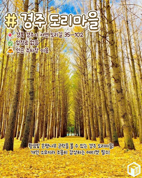 국내 대표적인 가을 명소들이 많은 경주입니다. 화려한 단풍들을 볼 수 있는 곳이 많은 경주 중 가을이면 황금빛을 발산하는 도리마을은 가을철 그 화려함이 극치에 달한다고 합니다.
