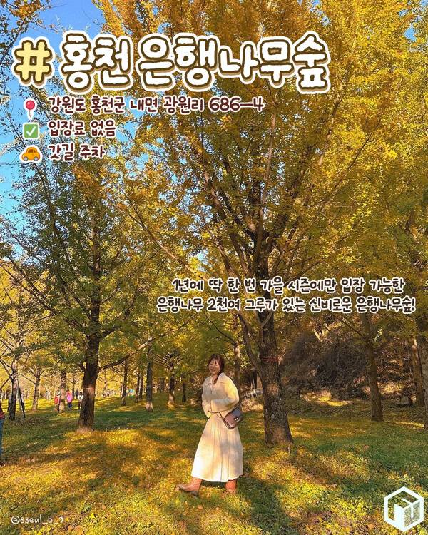 오직 1년 중 가을에만 방문할 수 있는 비밀스런 홍천 은행나무숲입니다. 홍천 은행나무숲은 개인 사유지로 농장주인이 아픈 아내를 위해 은행나무 묘목을 심기 시작해 숲을 이뤄 25년만에 개방을 시작했다고 합니다.