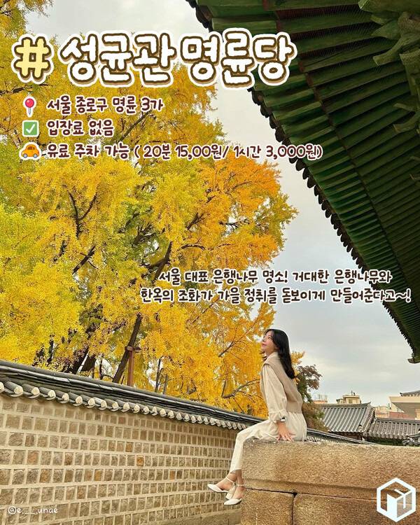 또 성균관대학교 내 명륜당은 유학자들의 위패를 모시고 제사를 지내는 곳인만큼 전통적인 건축물로 이뤄져 노란 은행나무와 함께 가을 운치를 더해 서울 은행나무 명소로 추천드립니다.