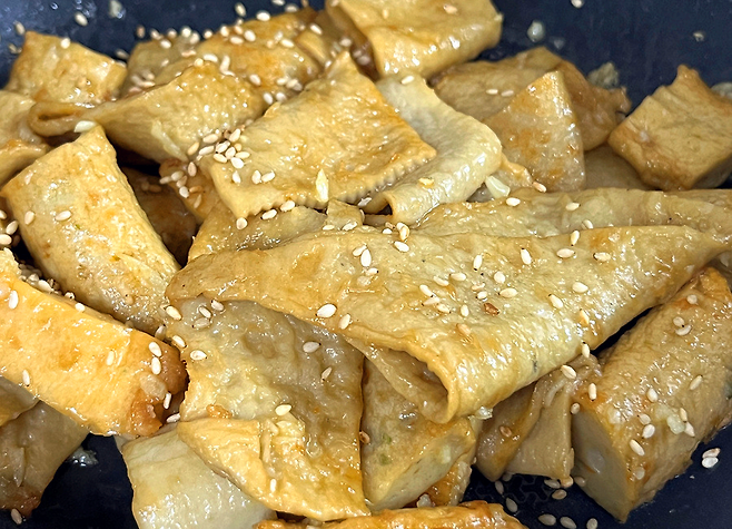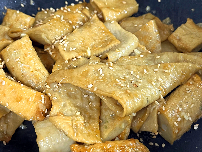 마지막에 참기름과 통깨를 뿌려서 마무리합니다. 물에 볶는 과정만 추가했는데도, 드셔 보시면 기존 어묵볶음과 확실히 다르다는 것을 느끼실 거예요!