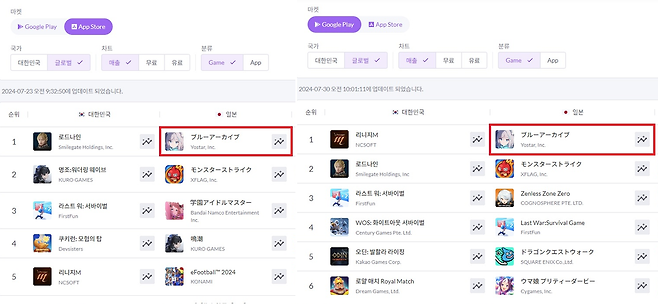 일본 구글 플레이 스토어에서도 7월 30일부터 8월 4일까지 6일 간이나 최고 매출 순위 1위를 유지하며 IP의 저력을 입증했다. 경쟁이 치열한 일본 모바일 게임 시장에서 이런 폭발적인 흥행력을 보유하고 있다는 것은 ‘블루 아카이브’가 최고 인기 게임의 자리를 지키고 있다는 의미다.