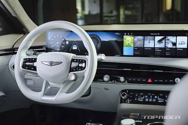 신형 GV70 전기차는 GV70 부분변경 기반 전기차다. 신형 GV70 전기차는 배터리 용량이 기존 77.4kWh에서 84kWh로 개선됐다. 신형 GV70 전기차는 국내 인증을 완료했는데, 1회 완충시 주행거리는 19인치 및 상온 기준 423km(도심 448, 고속393), 저온 기준 400km를 확보했다.