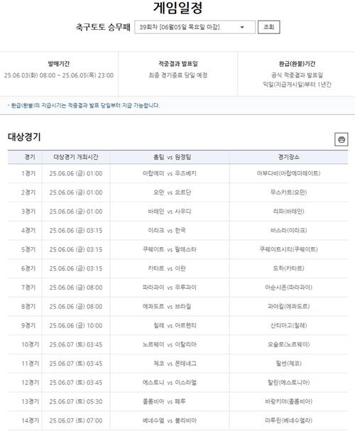 스포츠토토코리아 관계자는 "38회차는 단 1명의 1등 적중자가 전체 환급금 중 35억 원 이상을 수령한 이례적인 회차였다"며 "다음 회차인 39회차는 A매치가 대상 경기들로 선정돼, 축구팬들의 높은 관심이 예상된다"고 밝혔다.