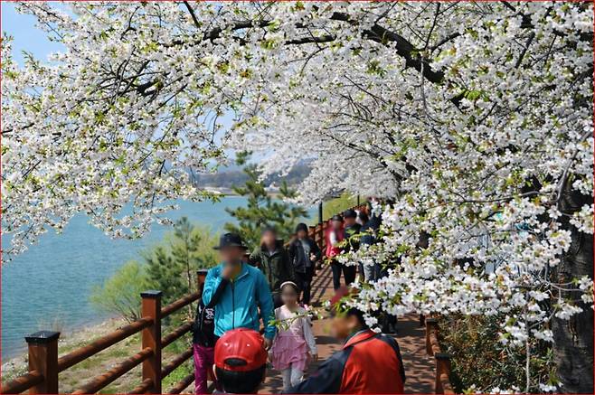 이곳의 진짜 매력은 벚꽃 시즌에 드러납니다. 4월 초부터 개화를 시작해 중순이면 절정에 이르는데, 이 시기에는 저수지를 따라 이어진 데크길 위로 벚꽃 터널이 형성됩니다. 바람이 불면 꽃잎이 흩날리며 수면 위로 떨어지고, 물빛이 분홍빛으로 물드는 장면이 연출됩니다.