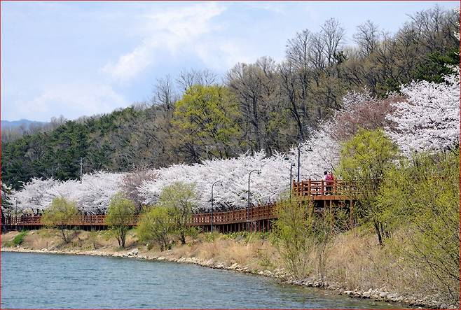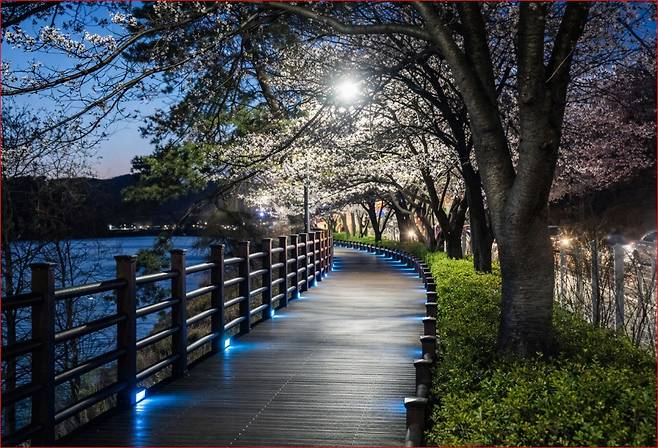 특징: 수면 벚꽃 풍경, 데크길, 숲길, 야간 조명 벚꽃이 어우러진 산책 코스입니다.