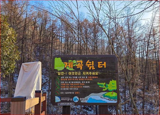숙박을 하지 않아도 휴양림의 주요 산책로와 계곡 쉼터, 치유숲길, 데크 산책로, 바라산 전망대는 자유롭게 이용할 수 있습니다. 의왕대간과 연결된 바라산 등산로는 약 1.8km로 부담이 크지 않아 가벼운 산행 코스로 적당합니다. 활엽수와 침엽수가 섞인 숲길 덕분에 계절에 따라 숲의 표정이 달라지고, 겨울에는 시야가 트여 삼림욕 동선이 한결 편안합니다. 아이와 함께라면 데크 산책로 위주로 짧게 걷는 일정이 무난합니다.