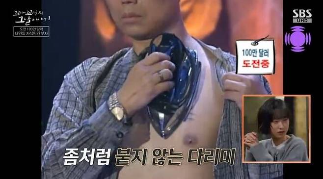 "안녕하세요. '도전 100만불 초능력자를 찾아라'에 패널로 출연했던 표인봉입니다. 패널들이 '우리도 붙나?' 하고 동전 몇 겹을 우리도 붙여보고 그랬는데. 웃긴 게, 저도 피부가 건성이 아니고 지성이에요. 그래서 저도 많이 붙더라고요."