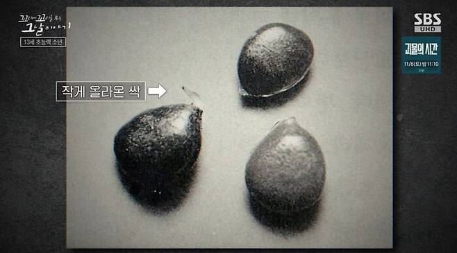이광자 씨가 손으로 잡고 있던 젓가락을, 김 군이 휴지만으로 쪼갰다는 거야. 학회 사람들이 모두 지켜보고 있는 상황에서. 김성한 군이 보여준 능력은 이뿐만이 아니었어. 어느 날 한 기자와 얘기를 나누고 있었는데, 김 군이 갑자기 실험을 해보겠다며 뭔가를 손에 쥐었어. 먹다 남은 감씨였어. 김 군이 감씨를 손에 쥐고 한 3분 정도 지났을까. 손을 쫙 펼쳐 보이니까, 감씨에서 작은 싹이 텄대. 갑자기 싹이 자랐다는 거야. 안 믿기지? 당시 기자가 찍은 사진이 있어.