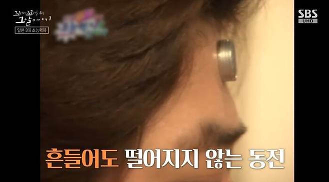 그 뒤 아키야마는 이마에 동전 붙이기를 시도했어. 점점 고개를 세우는 아키야마. 근데 고개를 흔들어도 동전이 떨어지지 않아. 동전은 무려 4개가 붙은 상태야. 그는 염력을 이용해 동전을 16개까지 붙여봤다고 주장했어.