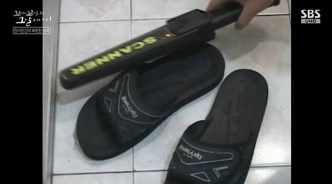 리듬에 맞춰 움직이는 발. 피디 검정단은 그가 늘 신는 슬리퍼에 주목했어. 그리고 비장의 무기를 꺼내 들었어. 바로 금속 탐지기. 만약 전력 장치가 숨겨져 있다면, 금속 탐지기가 반응할 거야. 그런데 이걸 본 모하메드, "띠닥!"이라 외쳐. '안된다'는 말레이시아어야. 당황한 모하메드가 "그건 절대 안 됩니다. 가까이 오지 마세요!"라고 소리쳤어.