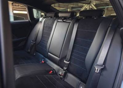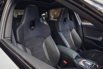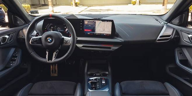 M235의 인테리어는 현대적이며, 대시보드의 백라이트 트림을 포함하여 실내 곳곳에 M 테마의 빨간색과 파란색 액센트가 적용되어 있습니다. 하지만 대부분의 표면이 단단한 플라스틱이라는 점은 아쉬움을 남깁니다. 고정식 헤드레스트와 라이트업 M 로고가 있는 M 스포츠 시트는 형태는 잘 잡혀 있지만, 다소 단단하게 느껴집니다. 뒷좌석은 경사진 루프라인 때문에 헤드룸이 넉넉하지는 않습니다.