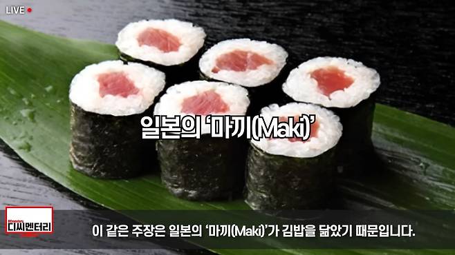 마끼 가운데 김밥의 원형으로 지목되는 데까마끼는 에도시대 말부터 메이지 시대 초기 동경에서 만들어진 것으로 전해집니다. 김초밥의 한 형태인데, 데까마끼는 일본이 제2차 세계대전에 뛰어들면서 군인들의 전투식량으로 발전, 당시 일제강점기였던 우리나라에도 이 같은 형태의 김초밥이 전해졌죠. 그래서 김밥의 일본 유래설에 동조하는 이들은 김밥이 일제강점기 말 우리나라에 전해졌다고 주장합니다.