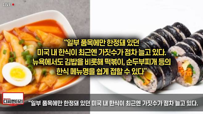 미국 시장조사업체 아이비스월드에 따르면 미국 내 한식산업은 꾸준한 성장세를 보이면서 2020년 57억 달러 매출을 올렸고 여러 성장요인 중 하나로 SNS에서의 한식 유행을 꼽습니다. 이는 이번에 김밥이 유행한 것처럼 다른 한식 역시 같은 방식의 성장을 기대할 수 있다는 뜻이죠.