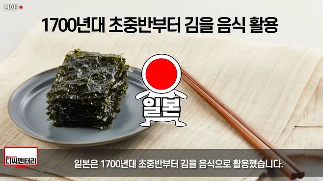 오후사쓰요의 박사가 저술한 '바다 채소'라는 책에 따르면 일본은 1700년대 초중반부터 김을 음식으로 활용했습니다. 이를 근거로 김밥은 시대적 정황상 우리나라가 훨씬 앞설 수밖에 없습니다. 만약 밥을 김에 싸먹는 것과 반찬으로 김을 먹는 것이 다르다고 말한다면 역으로 김에 밥을 싸먹는 문화가 일본으로 전해졌다고 보는 것이 맞죠. 왜냐하면 이미 삼국시대부터 우리 조상들이 현재의 일본 땅으로 건너가 살기 시작했으니까요.