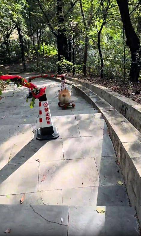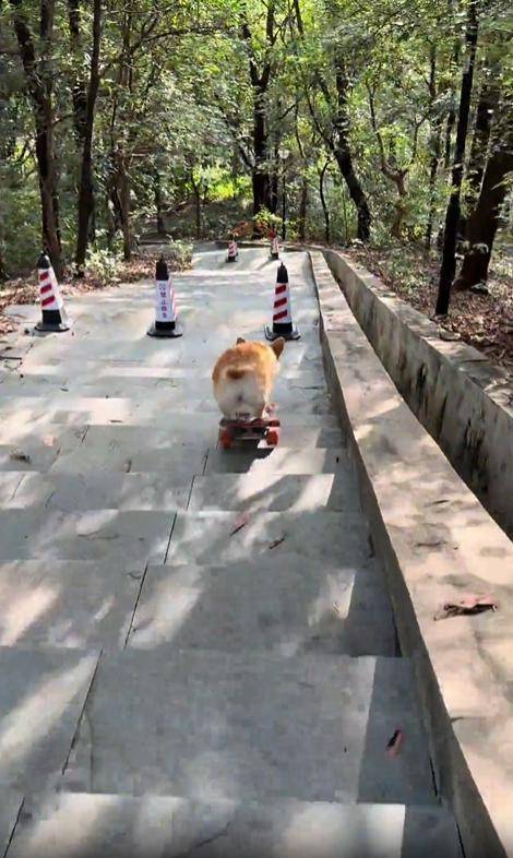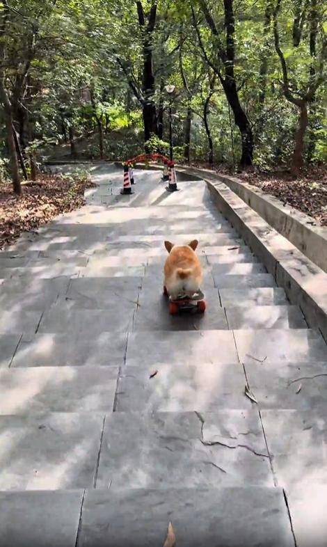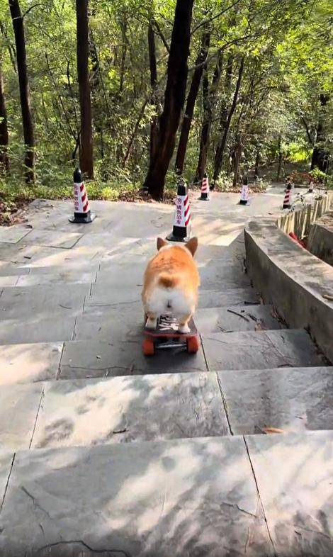 계단은 일반적으로 강아지에게는 장애물이지만, 이 웰시코기에게는 스릴 넘치는 슬로프일 뿐입니다. 어느새 보드는 착착착- 하고 계단을 따라 내려오고, 코기는 눈을 깜빡이지도 않은 채 집중한 표정으로 방향을 잃지 않습니다. 마치 익숙한 길을 걷는 듯한 여유가 느껴지죠. 주위의 나무와 흙길, 바람마저 그의 질주를 응원하는 듯 조용히 길을 열어줍니다.