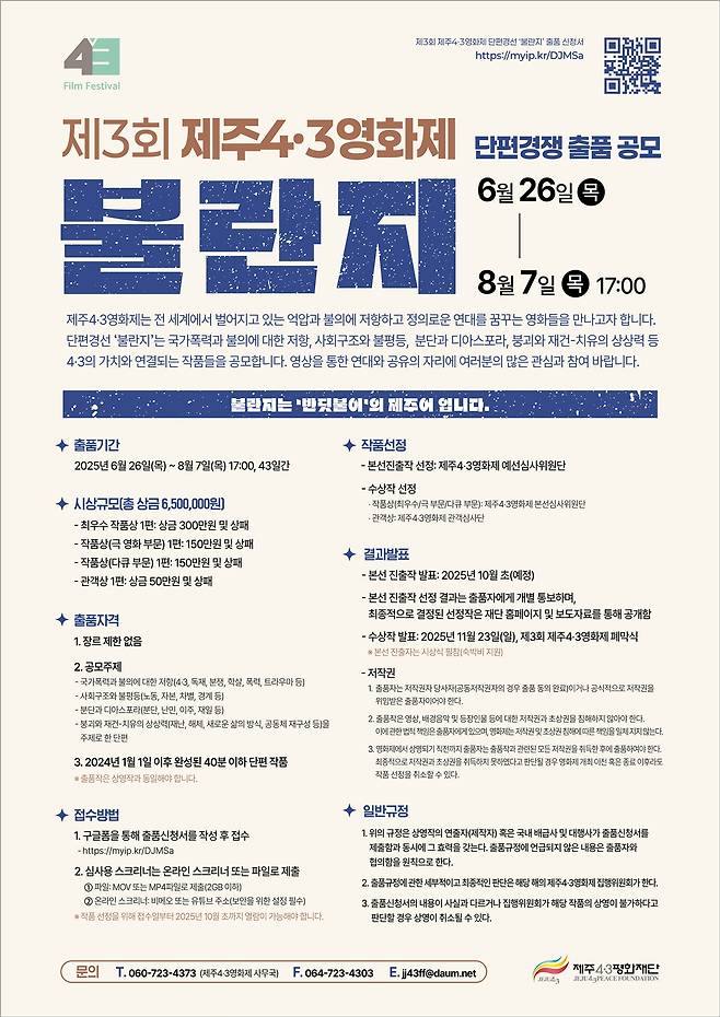 보다 구체적인 조건은 4․3이 지닌 역사적 의미와 현대적 가치를 공유할 수 있는 40분 이내의 단편영화다. 2024년 1월 1일 이후 완성된 작품이면 장르에 관계없이 출품 가능하다.