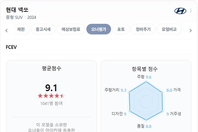 실제 차주들의 평가를 기반으로 차량 만족도 검사를 공개하는 ‘네이버 마이카 오너평가’에 따르면 현대차 넥쏘의 오너평가 평균 점수는 9.1점이다.