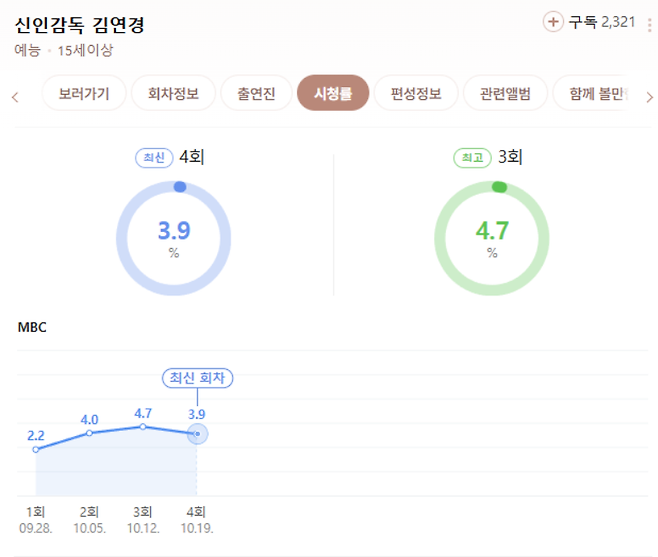 MBC 신인감독 김연경 5회가 오늘 밤 9시 10분 방송됩니다. 지난 4회는 분당 최고 시청률 5.6%를 기록하며 일요일 전체 프로그램 중 2049 시청률 1위를 차지했습니다. 3회는 수도권 기준 5.1%까지 올라가며 같은 시간대 미운 우리 새끼의 절반 가까운 시청률을 기록했습니다.