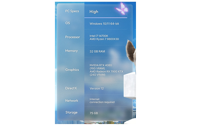 그래픽카드는 2021년 초에 출시한 RTX 3060 8GB 또는 비슷한 체급인 라데온 RX 6600 을 요구합니다. 이 두 제품들은 새 제품을 아직 구할 수 있는데요. 다만 오래된 재고 제품들이기 때문에 최신 기능들이 지원되지 않는 단점이 있고 가성비도 썩 좋은 편은 아닙니다. 그래서 가능하다면 RTX 4060. 그리고 라데온 RX 7600을 구하시는 것이 좋습니다. 메모리는 16GB, 저장공간은 50GB를 요구합니다.