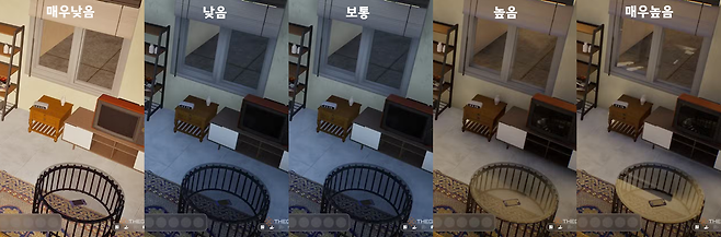 최저(매우 낮음) 프리셋에서는 빛의 세기나 종류를 구분하지 않고 실내를 일률적으로 밝게 처리합니다. 그림자가 없어서 원근감이 느껴지지 않고 어색해 보이죠. 낮음/보통 프리셋에서는 실내 조명 유무를 인식하지만 빛이 실내에 퍼지는 것이 약간 어색하게 묘사될 때가 있습니다. 자연스러운 것은 그림자와 빛 반사를 모두 표현하는 높음/가장높음 프리셋이며 이 단계에서는 레이트레이싱을 활용하는 것으로 보입니다.