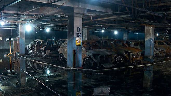 전기차 화재 대응에 스프링클러 효과는 어느 정도일까요? 지난 5월 한국토지주택공사(LH)가 개최한 지하 주차장 전기 화재 대응 연구보고회 연구 결과를 보시죠. LH로부터 '지하 주차장 전기차 충전 구역 소방시설 개발 연구용역'을 수행한 한국건설생활환경시험연구원(KCL)은 천장에 설치된 스프링클러와 더불어 바닥에서 분사되는 하부 주수 장치 추가 설치 등의 상황을 가정해 실험을 수행했습니다. 연구 결과는 주차장 천장에 설치된 스프링클러 설비만 안정적으로 작동할 경우 인접 차량으로의 확산을 막을 수 있다는 결론입니다. 최초 화재 발생을 예방하진 못하더라도 불이 번지는 걸 막는 데는 역할이 충분하다는 겁니다.