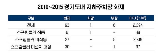 이렇게 중요한 스프링클러가 제대로 작동하고 있는지는 의심스럽습니다. 지난 2016년에 한국 방재학회지에 게재된 '지하 주차장 스프링클러 설비의 신뢰성에 관한 연구'에는 지난 2010년부터 6년간 경기도 내 지하 주차장 발생 화재를 분석한 결과가 있습니다. 해당 기간 모두 63건의 화재가 발생해 1명 사망, 6명 부상했고 재산 피해는 23억 9천만 원이었습니다. 건물 유형별로는 아파트 52건, 복합건축물 4건, 근린생활시설 3건, 업무시설 3건 등입니다.