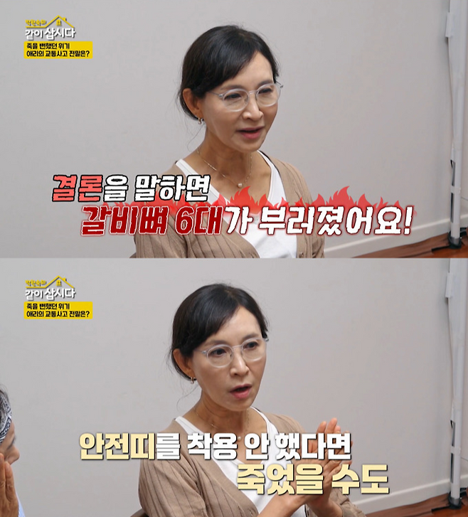 차는 폐차할 지경이었고 갈비뼈 6개가 부러지는 큰 부상을 입은 정애리. 다행히 얼굴은 다치지 않아, 다친 몸을 이끌고 열흘 만에 드라마를 촬영하러 가는 강행군을 감행했다고 한다.
