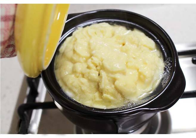 중약불로 뚝배기를 살짝 예열한 후, 준비한 계란물을 부어줍니다. 약불에서 뚜껑을 덮고 7~10분 정도 천천히 익힙니다.